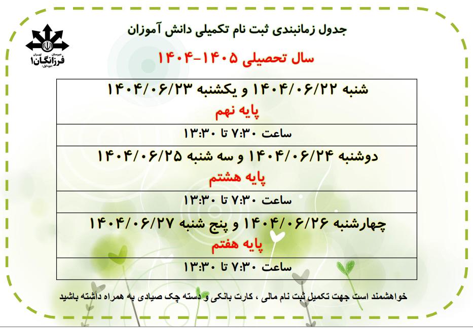 * حضور دانش آموزان از ساعت 7:00 از درب غربی امکان پذیر است و مراسم صبح گاه ساعت 7:20 برگزار می گردد .